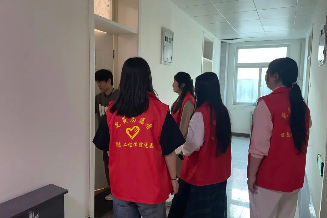 在卫生检查环节,跟随着学生党员们走进一间间寝室。仔细查看地面是否干净、物品摆放是否整齐、床铺是否整洁,对表现优秀的寝室给予表扬与鼓励,针对存在问题的寝室,耐心地提出整改建议并帮助整理,以实际行动引导同学们养成良好的生活习惯,共同打造温馨、整洁的寝室氛围。