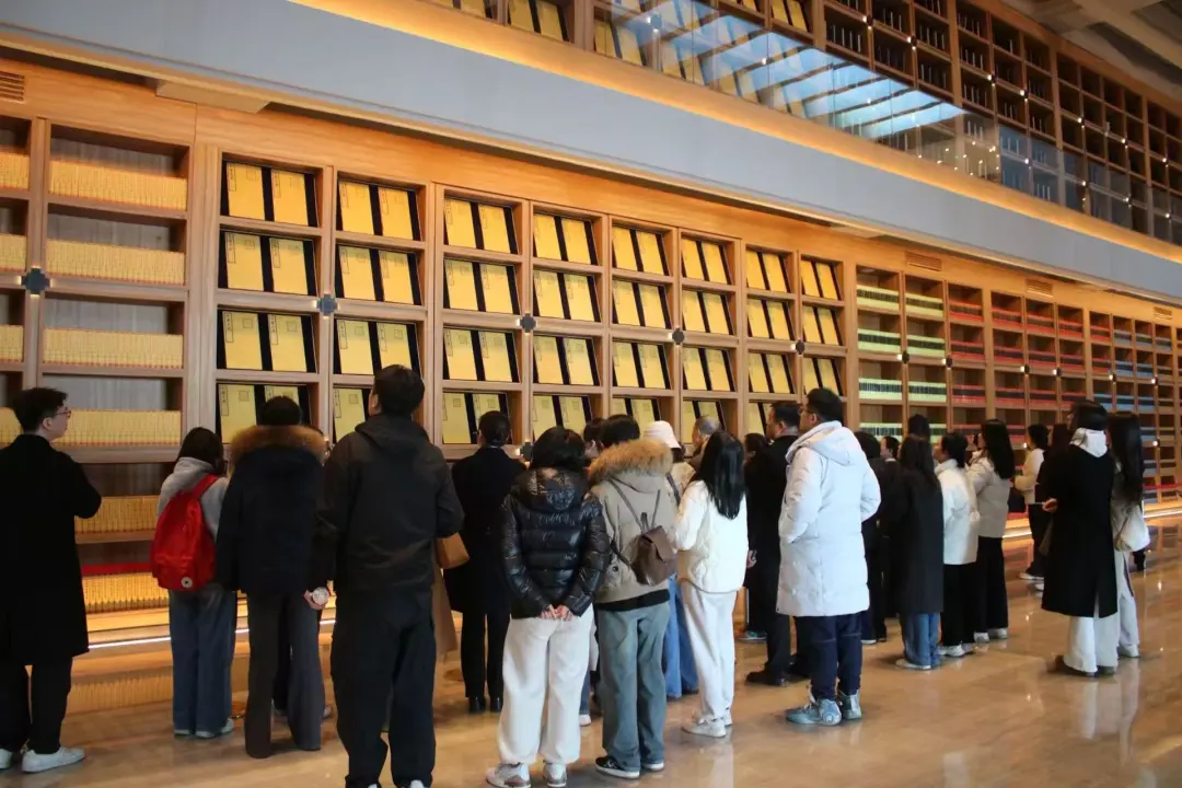 步入场馆,序厅的巨型通顶书墙率先带来视觉冲击,书墙整齐陈列着5万册精品图书,浓郁书香扑面而来。跟随者讲解员的脚步,大家走进《赓续文脉 踔厉前行——中华文化经典版本展(西部篇)》展厅,古籍善本、传统文化典籍与革命文化版本依次呈现,跨越千年的文明载体静静陈列。大家或驻足凝视泛黄的古籍手稿,或俯身查看数字版本展示屏,在轻声交流中,深刻体会到版本作为 “中华文化种子基因库” 的厚重价值。