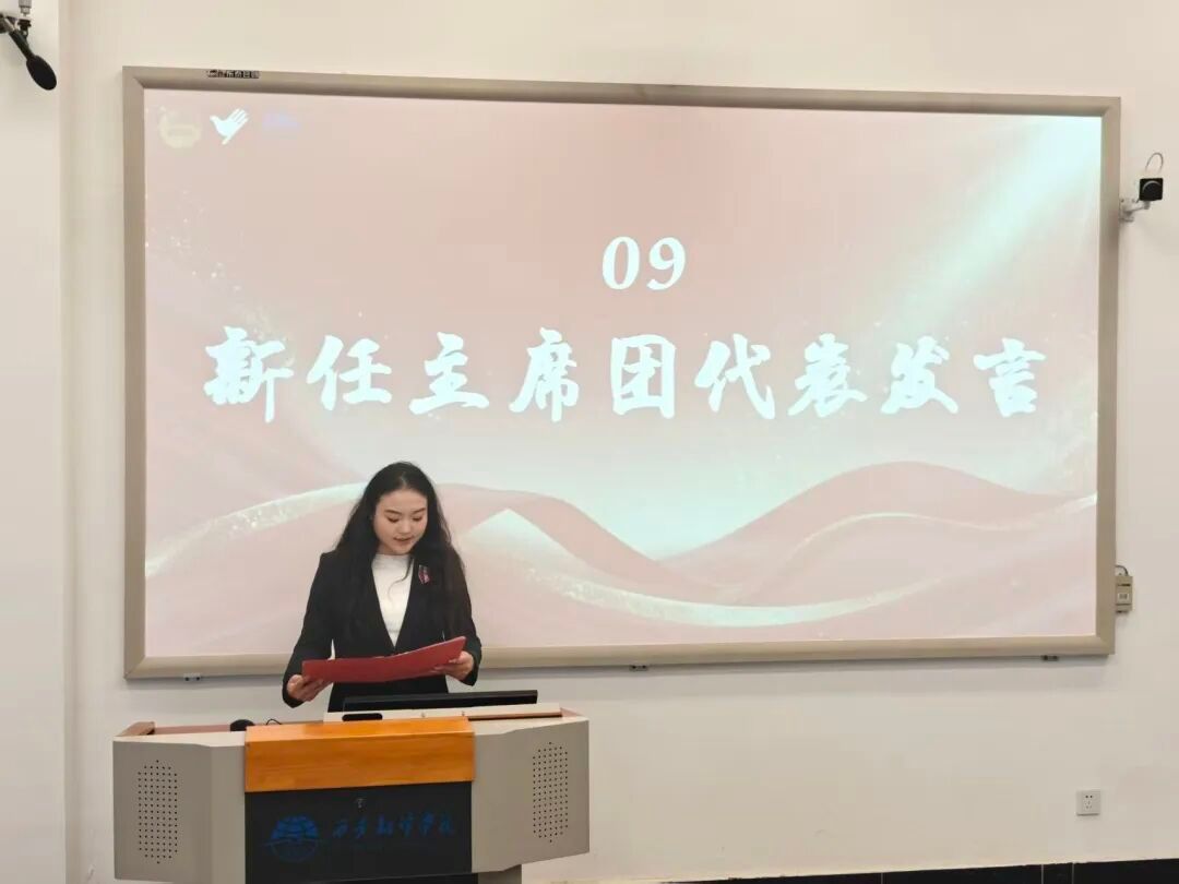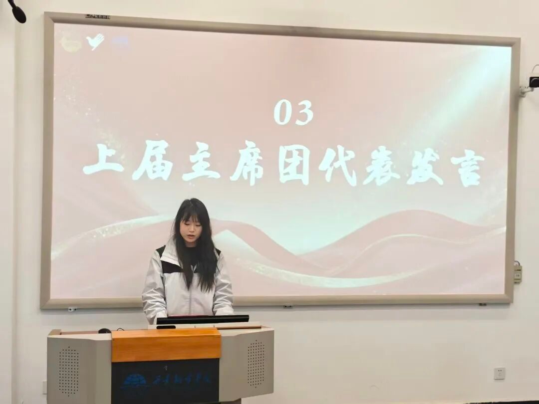 团总支副书记陈雨婷对上一届青年志愿者协会全体成员的工作给予了充分的肯定,感谢他们为学院辛勤付出。同时也希望青协能够坚守初心,凝聚合力,并鼓励青协成员们将专业价值融入志愿服务当中,期望他们在志愿服务中锤炼自己,增长才干。
