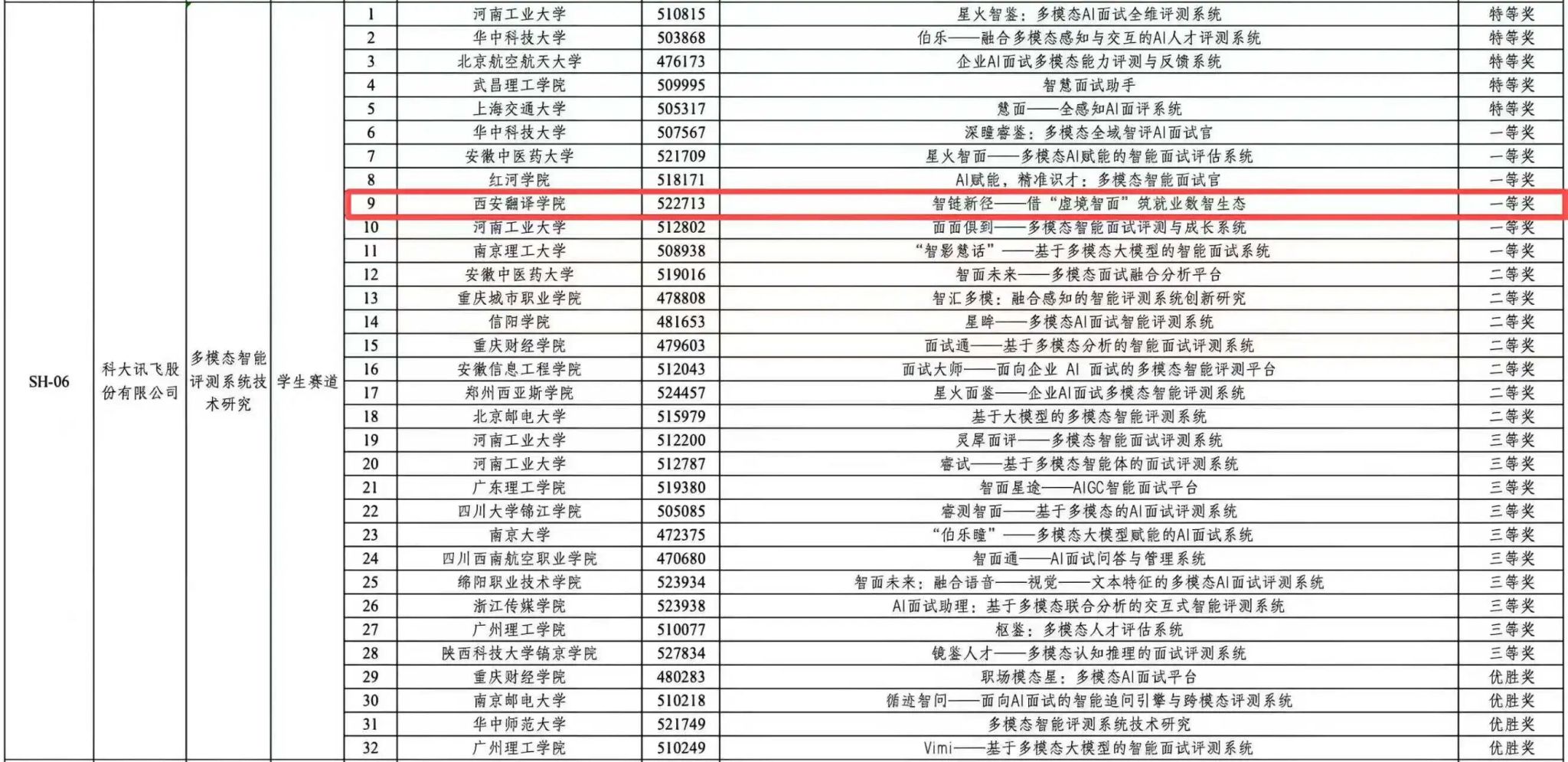这是陕西民办高校在该赛事该组别中首次进入一等奖公示榜,实现历史性突破。团队核心成员由文鑫、张飞宇、张晓怡等 7 名同学组成,项目以突出的技术领先性和强实用性获得评审高度认可。