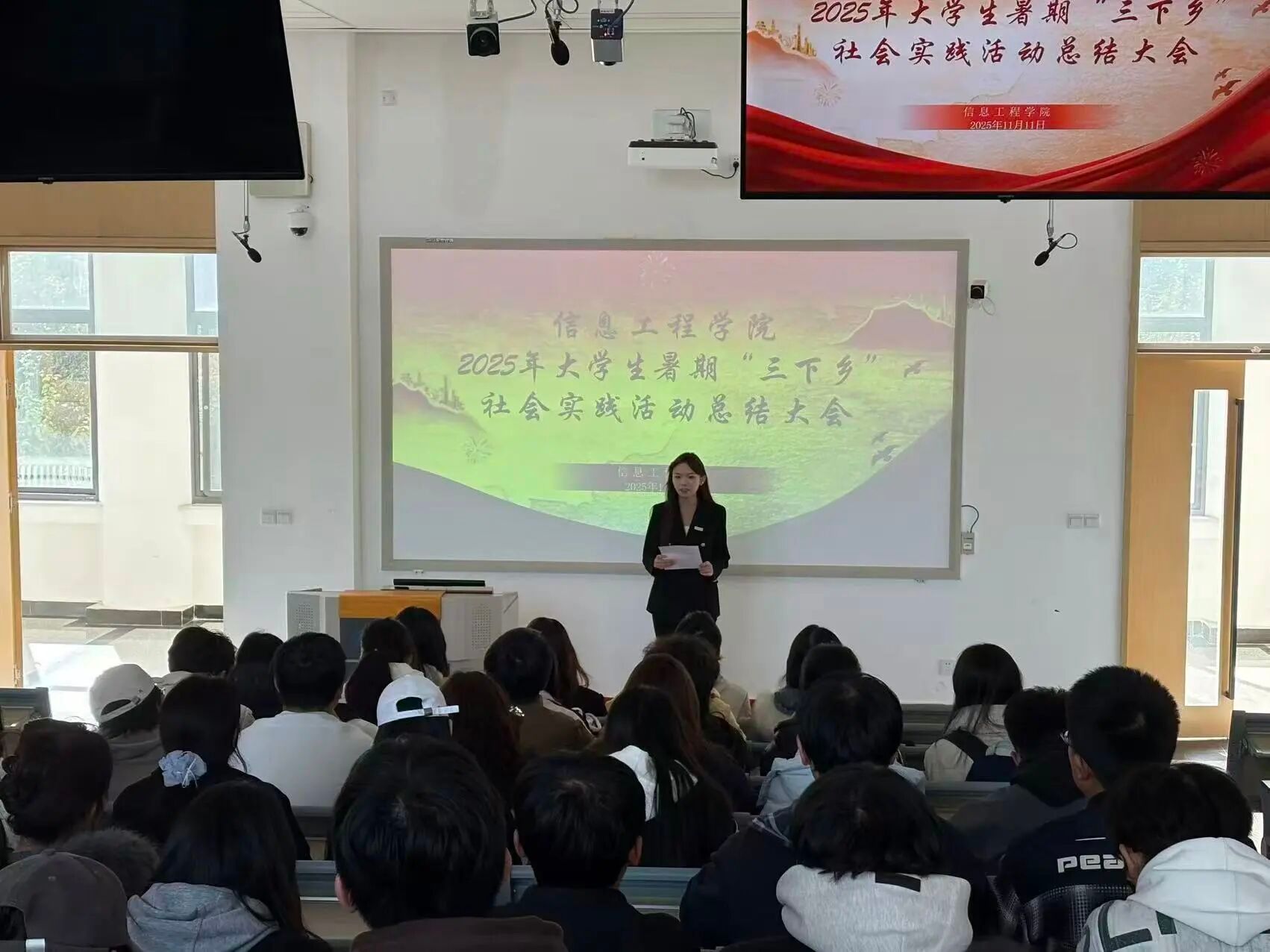 会上,学院10支实践团队代表依次上台汇报。他们通过精心制作的PPT,生动再现了实践过程中的关键环节与感人瞬间:活动前期,团队坚持问题导向,通过线上问卷、实地走访等方式,深入乡村一线与当地村委会、企业对接,精准识别出农产品电商推广乏力、基层信息化设施维护不足、青少年科学素养培育缺位等现实难题;实践期间,队员们发挥信息工程专业优势,深入田间地头、产业园区,与村干部、创业者、农户面对面交流,围绕“乡村数字化转型”主题开展专项调研,累计回收有效问卷超百份,形成了具有现实指导意义的调研报告,为地方数字化建设贡献了青年智慧。代表们结合具体服务案例,分享了将课堂知识转化为服务能力的成长历程,充分展现了新时代青年学子的专业担当与社会责任感。