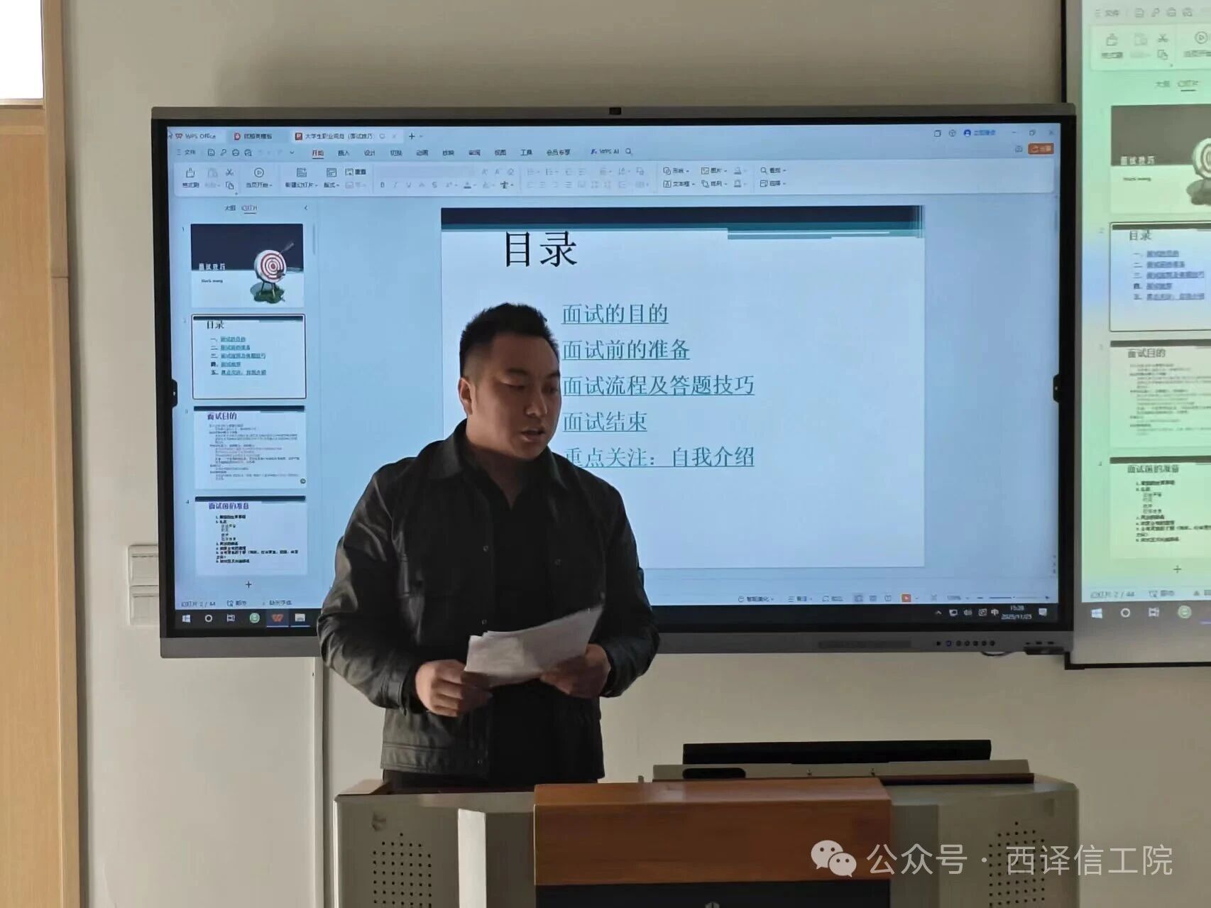 随后,宣讲员就简历撰写与面试安排给出针对性指导。简历制作方面,需细化专业技能呈现,明确计算机操作熟练度、相关政策掌握程度等具体维度,重点突出辅修课程与目标岗位的适配性,同时充分彰显个人核心优势;面试形式以线上面试为主,提醒应聘者需提前准备符合要求的视频设备,确保面试顺利开展。