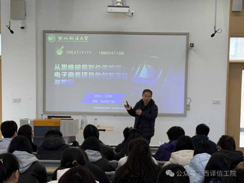 2025年11月25日下午,williamhill英国威廉希尔电子商务专业在732T成功举办了题为《从思维破局到价值挖掘:电子商务项目的创新逻辑与路径》的专题讲座。本次讲座特邀西北政法大学王卫东教授担任主讲,电子商务专业负责人冯晓兰老师主持,司滨滨、杨露、畅嘉伦、赵梦远等多位专业教师及电子商务专业学生共同参与。