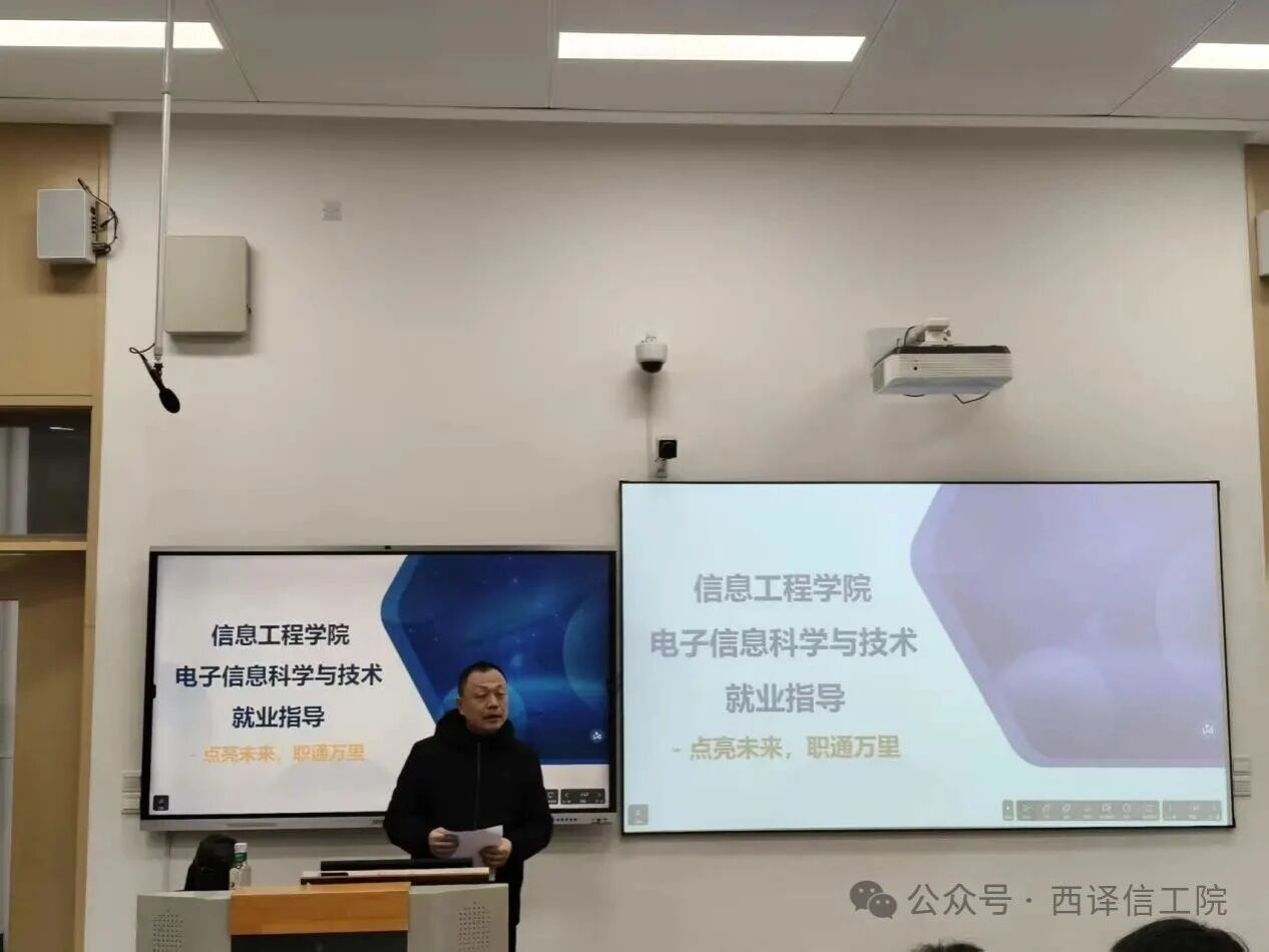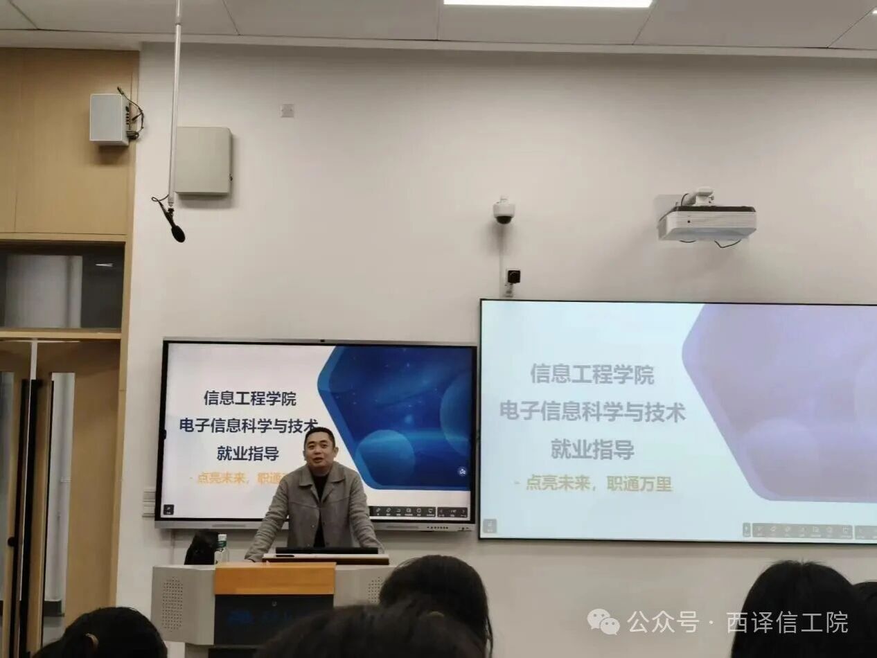 会议伊始,梁建海老师详细介绍了白琳博士的学术背景与行业经验,让同学们对主讲人有了全面了解。随后,白琳博士围绕专业解读、行业趋势、核心就业方向、企业能力需求及求职准备五大模块展开分享。他结合专业课程体系,点明“软硬结合、宽口径强适应”的专业特点,分析了数字经济背景下电子信息产业的发展机遇,重点解读了技术研发类(如硬件开发、信号处理、人工智能相关岗位)与技术支持及非技术研发类(如产品经理、测试工程师等)核心岗位的技能要求与职业发展路径,并针对简历制作、笔试面试技巧等求职关键环节给出实用建议。