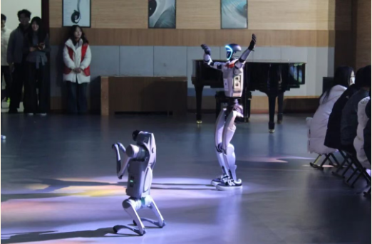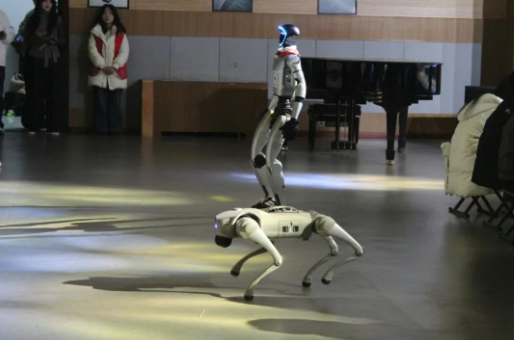 双足人形机器人与四足机械狗的同台表演,成了全场焦点。前者舒展肢体、抬手摆臂自带韵律,后者弓身、迈步灵活配合,金属关节的轻响里,藏着信工学子在科技实践领域的钻研成果。